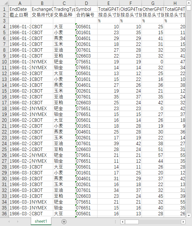 交易品种 截止日期 总持仓 基金多单 基金空单 基金净多 基金多单增减 基金空单增减 基金多单比例(%) 基金空单比例(%) 商业多单 商业空单 商业净多 商业多单增减 商业空单增减 商业多单比例(%) 商业空单比例(%) 可报告多单 可报告空单 可报告多单增减 可报告空单增减 可报告多单比例(%) 可报告空单比例(%) 非报告多单 非报告空单 非报告多单增减 非报告空单增减 非报告多单比例(%) 非报告空单比例(%) 其它多单 其它空单 其它净多 其它多单增减 其它空单增减 其它多单比例(%) 其它空单比例(%) 套做量 套做增减 套做比例(%)