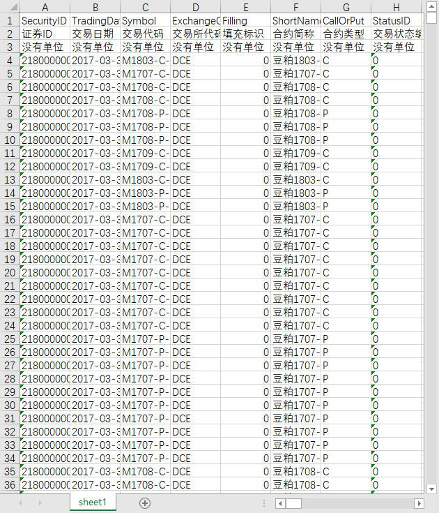 证券ID 交易日期 交易代码 交易所代码 填充标识 合约简称 合约类型 交易状态编码 交易状态 标的证券ID 标的期货交易代码 标的期货简称 标的期货持仓量 标的期货成交量 标的期货成交额 标的期货前结算 标的期货前收盘 标的期货今开盘价 标的期货今收盘价 标的期货今最高价 标的期货今最低价 标的期货今结算价 标的期货涨跌幅 标的期货涨跌幅(收盘价) 标的期货涨跌幅(结算价) 标的期货振幅 标的期货涨停价 标的期货跌停价 标的期货主力合约标识 涨停价 跌停价 日开盘价 日最高价 日最低价 日收盘价 日结算价 前收盘价 前结算价 持仓量 昨持仓量 持仓量变化 涨跌1 涨跌2 涨跌幅 涨跌幅(收盘价) 涨跌幅(结算价) 振幅 成交量 成交均价 成交金额 行权量 行权价 Delta Delta2 Gamma Vega Theta Rho 买方单位最低行权保证金 卖方单位保证金 内涵价值 时间价值