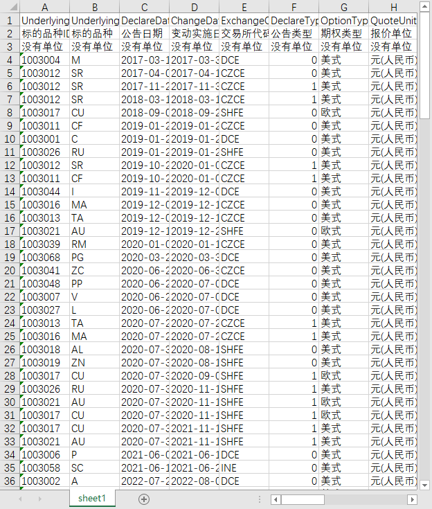 标的品种ID 标的品种 公告日期 变动实施日期 交易所代码 公告类型 期权类型 报价单位 交易单位 最小变动价位 每日价格最大波动限制 合约月份 交易时间 到期日规则 行权日规则 交易手续费 单笔市价最大委托数量 单笔限价最大委托数量 单笔最小买入量 单笔最小卖出量