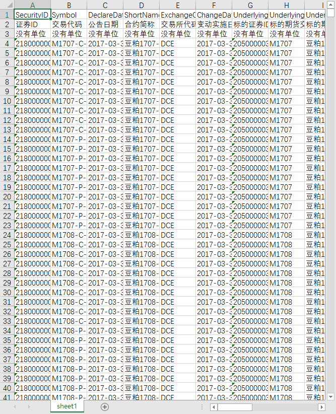 证券ID 交易代码 公告日期 合约简称 交易所代码 变动实施日期 标的证券ID 标的期货交易代码 标的期货简称 挂牌基准价 首日上市日期 最后交易日 期权类型 合约类型 行权价 行权价格间距 最小变动价位 合约月份 每日价格最大波动限制 最大涨跌幅限制 标的品种ID 标的品种 合约乘数