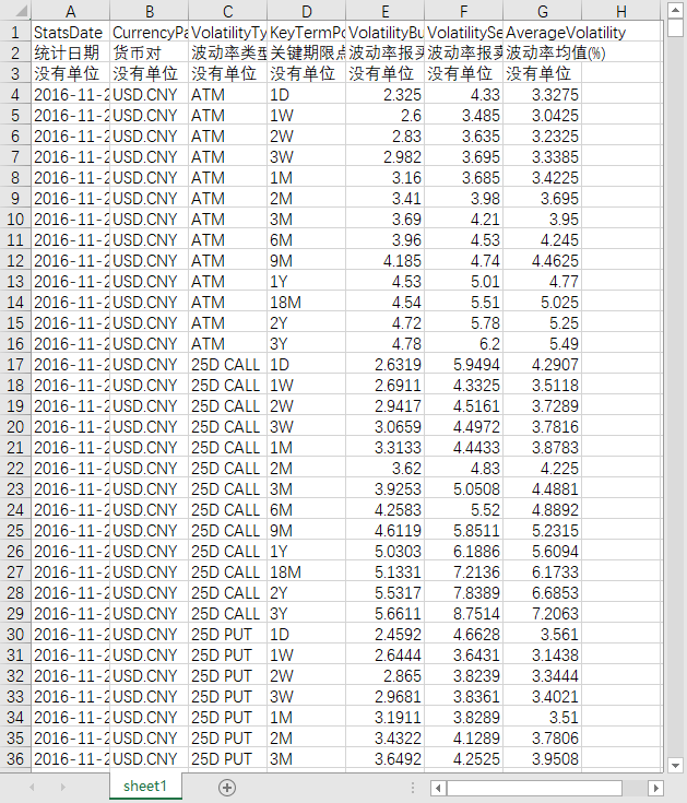 统计日期 货币对 波动率类型 关键期限点 波动率报买(%) 波动率报卖(%) 波动率均值(%)