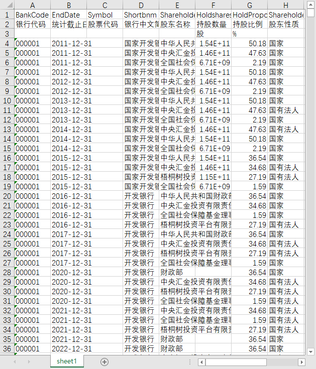 银行代码 统计截止日期 股票代码 银行中文简称 股东名称 持股数量 持股比例 股东性质 股份性质 持股排名 股东关联性 备注