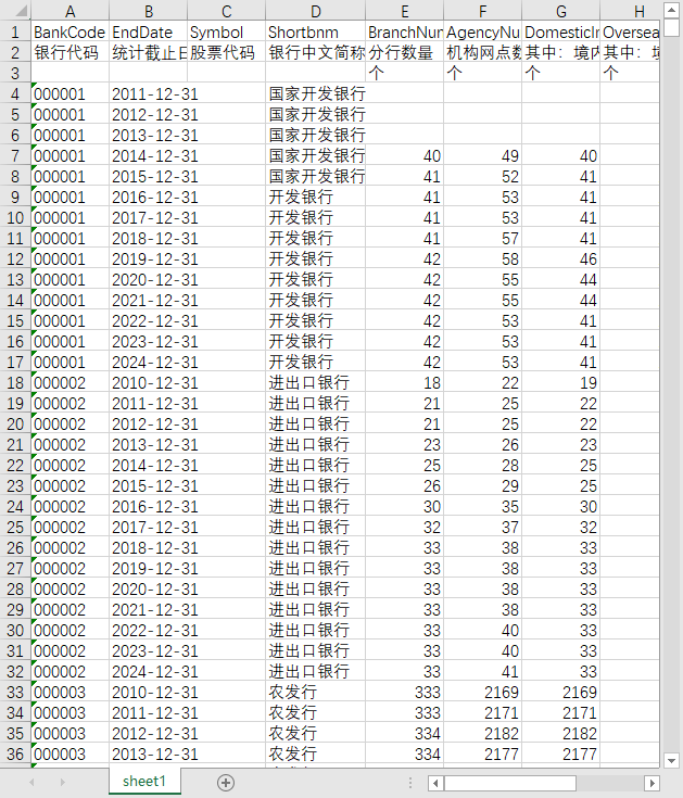 银行代码 统计截止日期 股票代码 银行中文简称 分行数量 机构网点数量 其中:境内网点数量 其中:境外网点数量 在职员工总数 其中:本科及以上员工人数 其中: