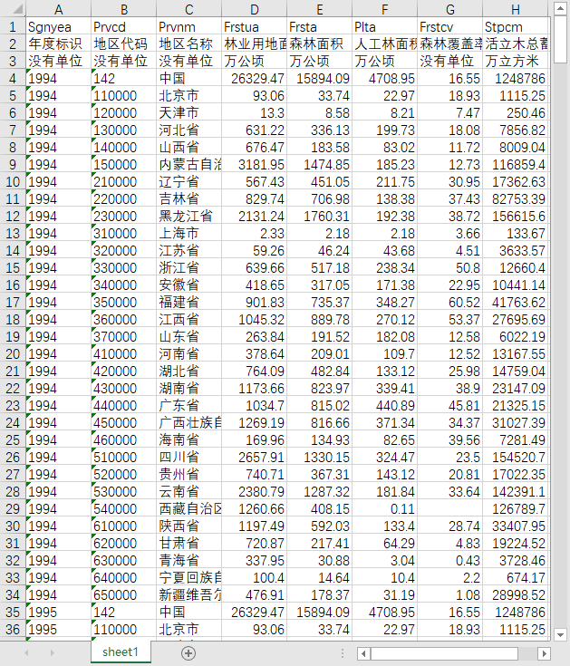 年度标识 地区代码 地区名称 林业用地面积 森林面积 人工林面积 森林覆盖率(%) 活立木总蓄积量 森林蓄积量