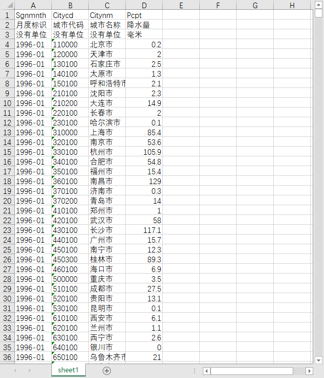 月度标识 城市代码 城市名称 降水量 平均气温 平均相对湿度日照时数