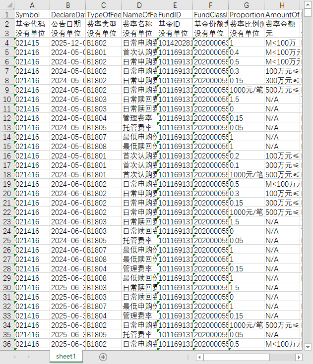 基金代码 公告日期 费率类型 费率名称 基金ID 基金份额类别ID 费率比例(%) 费率金额 期限说明 有效起始日 失效日期