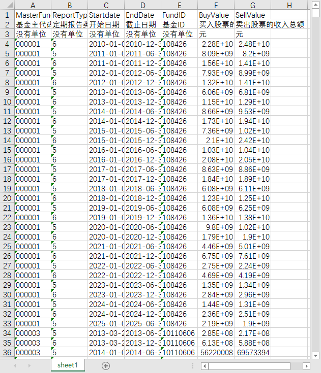 基金主代码 定期报告类别编码 开始日期 截止日期 基金ID 买入股票的成本总额 卖出股票的收入总额