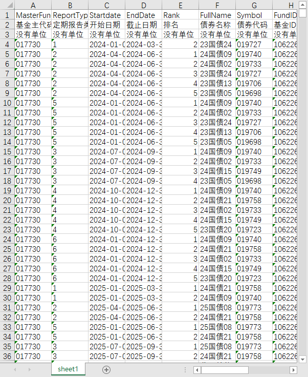 基金主代码 定期报告类别编码 开始日期 截止日期 排名 基金名称 基金ID 基金类型 运作方式 基金管理人 公允价值 占基金资产净值比例(%) 基金代码