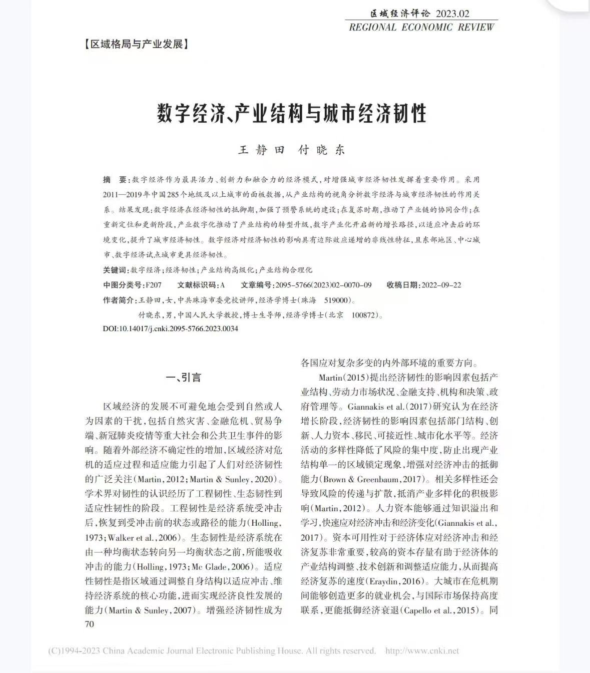 [2]王静田,付晓东.数字经济、产业结构与城市经济韧性[J].区域经济评论,2023(02):70-78.