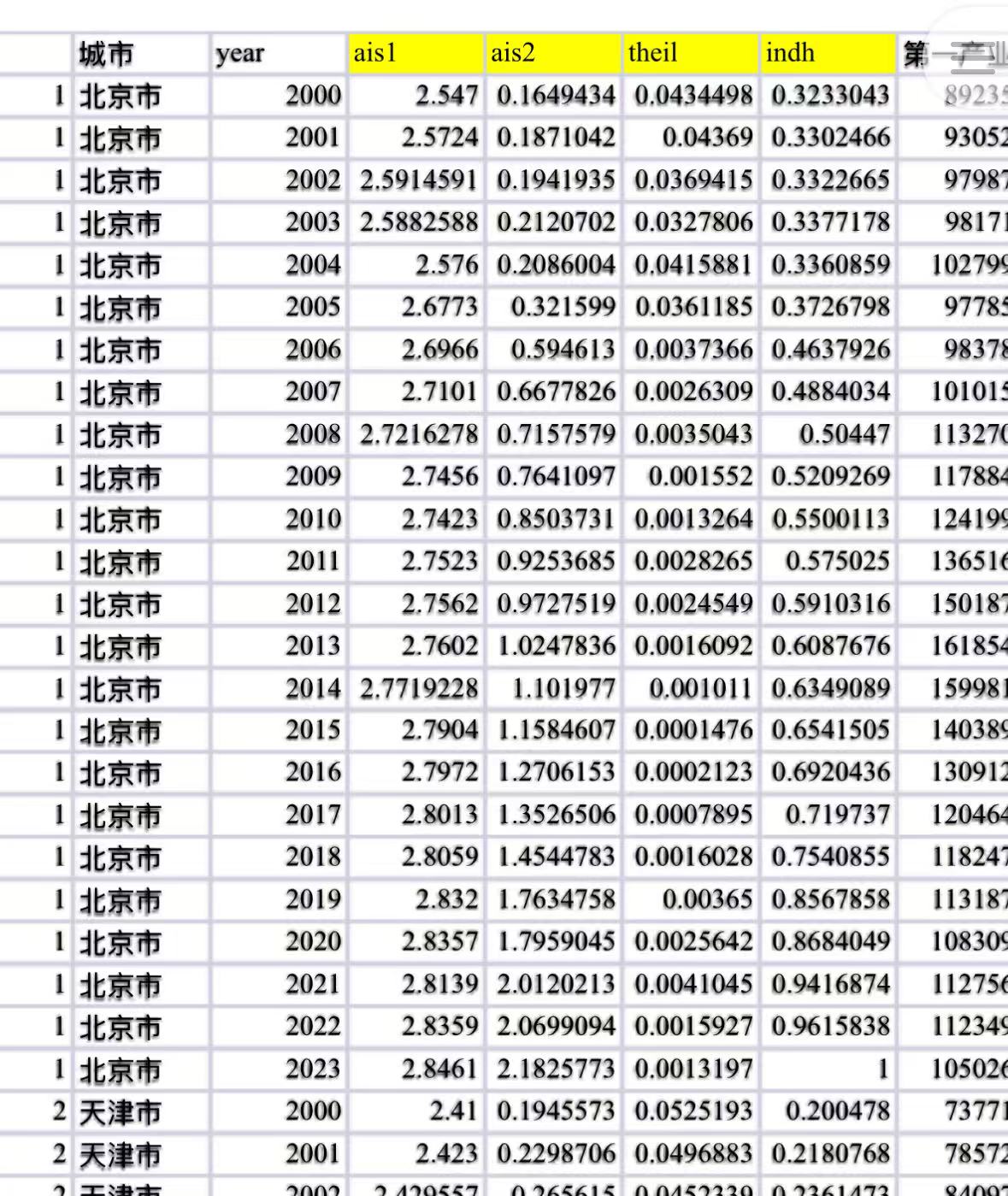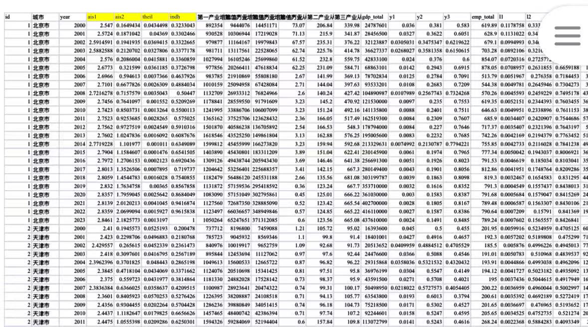 其中,产业结构高级化参照两个文献有三个结果,第一个是参考[1]袁航,朱承亮的文章,对产业结构高级化的质和量分别进行计算。第二个是参考[2]王静田等人的文章,构建了另外一个产业结构高级化的指标。等于产业结构高级化有三个结果,自己看哪个合适用哪个。