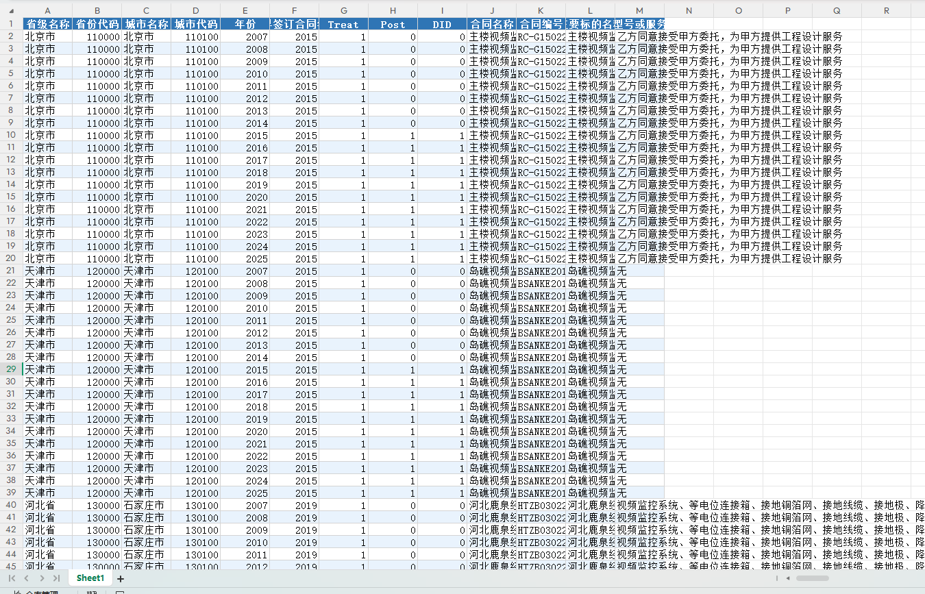 本数据参照梁平汉、郭宇辰和赵玉兰(2023)的做法,基于中国政府采购网爬取的合同公告数据构建:在样本期间内,以城市首次签订“视频监控”的采购合同当年起,取值为1,否则取0。