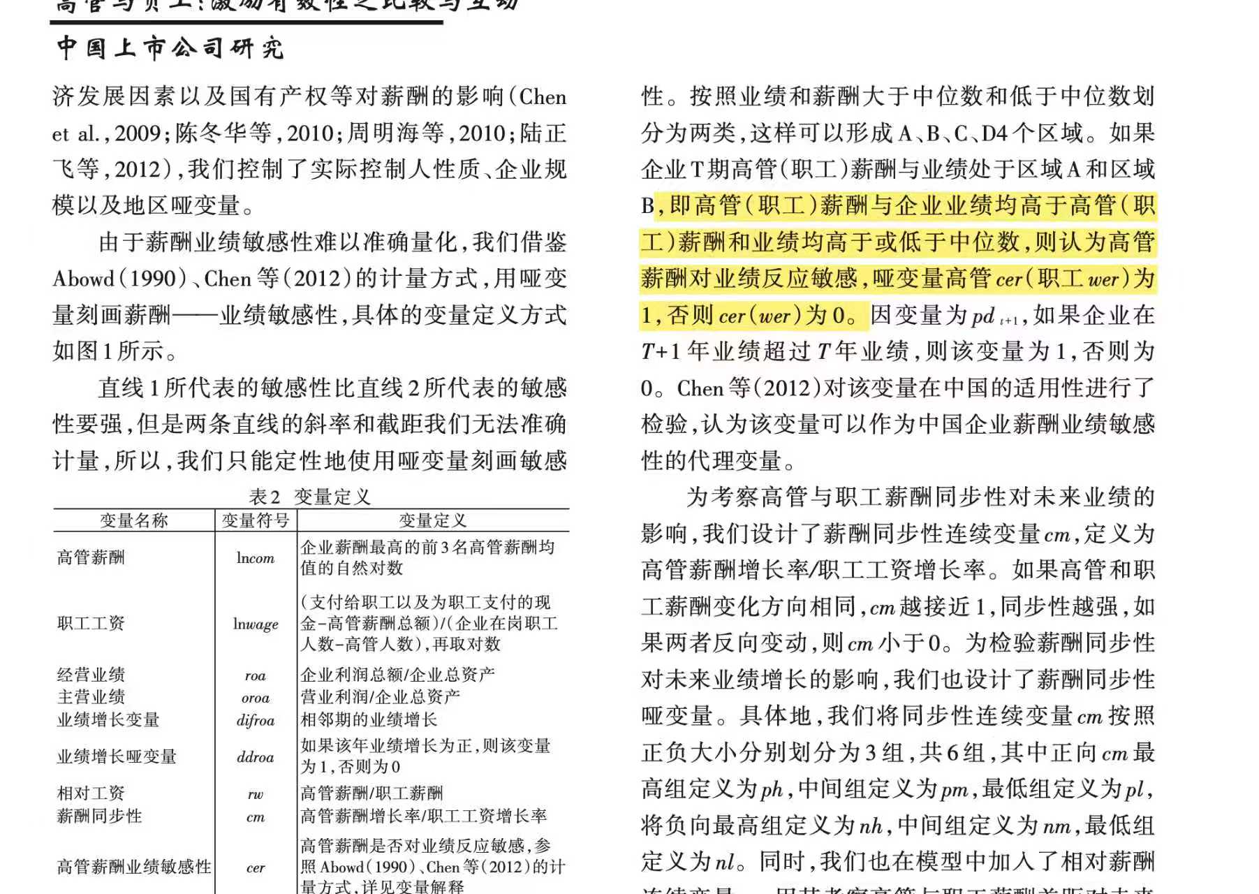 2.计算说明:参考《管理世界》陈冬华老师的做法,按照业绩和薪酬大于中位数和低于中位数划分为两类, 这样可以形成 A、 B、 C、 D4 个区域。如果企业 T 期高管 (职工) 薪酬与业绩处于区域 A 和区域B, 即高管 (职工) 薪酬与企业业绩均高于高管 (职工) 薪酬和业绩均高于或低于中位数, 则认为高管薪酬对业绩反应敏感, 哑变量高管 cer (职工 wer) 为1, 否则 cer (wer) 为 0。