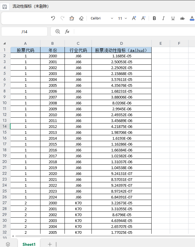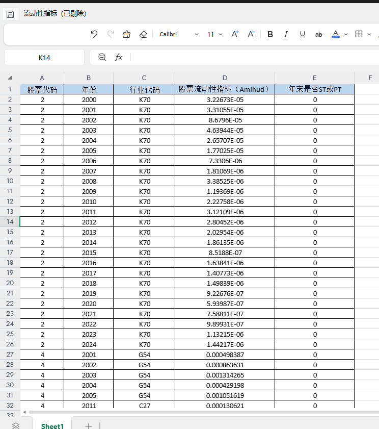 包含指标:股票代码 年份 行业代码 股票流动性指标(Amihud) 年末是否ST或PT。