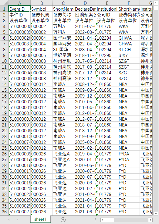 事件ID 证券代码 证券简称 回购预案公告日期 公司ID 证券简称英文 公司全称 公司全称英文 首次实施回购日期 回购完成日期 回购目的 回购方式编码 回购方式 回购用途 回购定价原则 回购股份种类 回购资金来源编码 回购资金来源 回购资金来源说明 拟回购数量上限 拟回购数量下限 拟回购股份占总股本的比例(%) 拟用于回购的资金总额上限 拟用于回购的资金总额下限 币种 拟回购起始日期 拟回购终止日期 说明