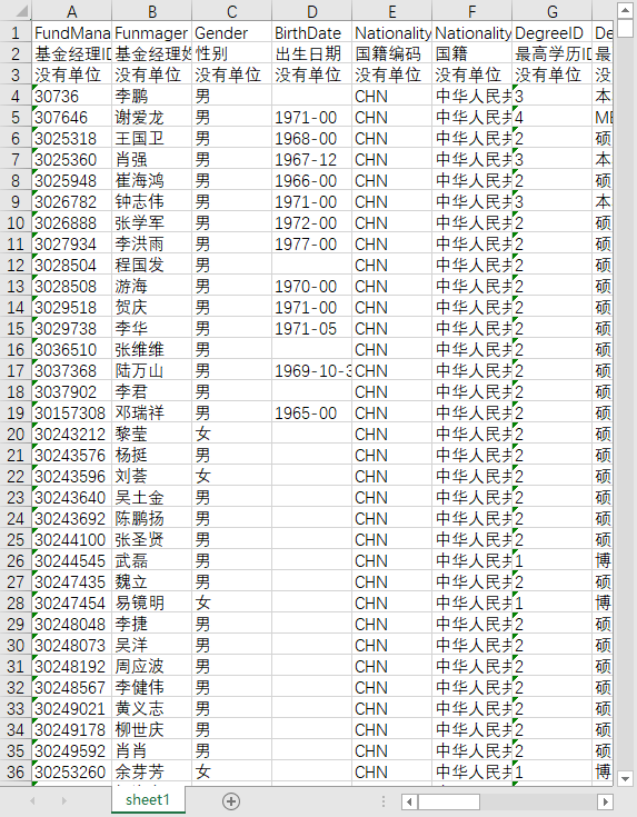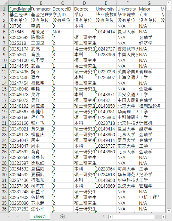 基金经理ID 基金经理姓名 学历ID 学历 毕业院校ID 毕业院校 专业 专业背景