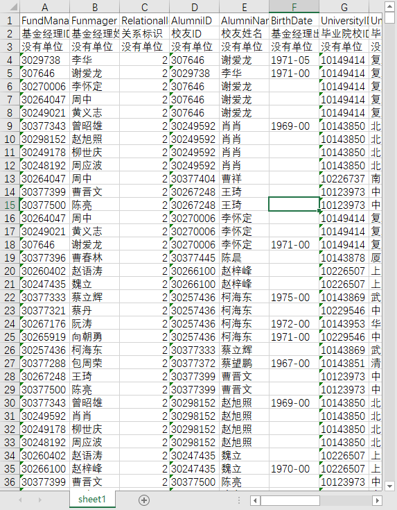 基金经理ID 基金经理姓名 关系标识 校友ID 校友姓名 基金经理出生日期 毕业院校ID 毕业院校 校友学历ID 校友学历 校友专业 校友性别 校友出生日期