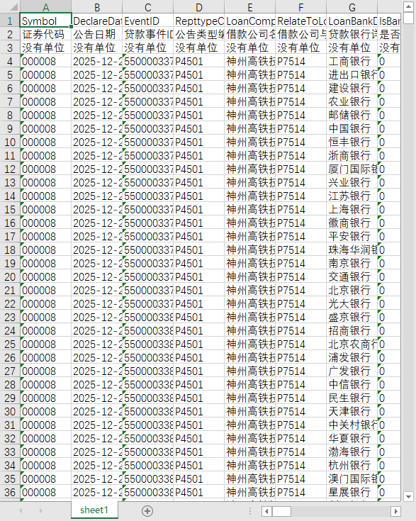 证券代码 公告日期 贷款事件ID 公告类型编码 借款公司名称 借款公司与上市公司关系编码 贷款银行详情 是否银团 贷款银行 贷款银行数 银行所在地 是否签约 是否终止 贷款进程 签约日期 币种编码 币种 贷款金额上限 贷款金额下限 最新贷款金额 累计贷款金额 最近还款金额 最新还款日期 累计还款金额 贷款期限 续借期限 续借日期 贷款起始日期 贷款结束日期 逾期日期 逾期利率(%) 逾期金额 基准利率(%) 贷款利率(%) 贷款浮动利率 贷款类型编码 是否有抵押质押物 资金投向 资金投向编码 公告标题 公告内容 披露情况 备注