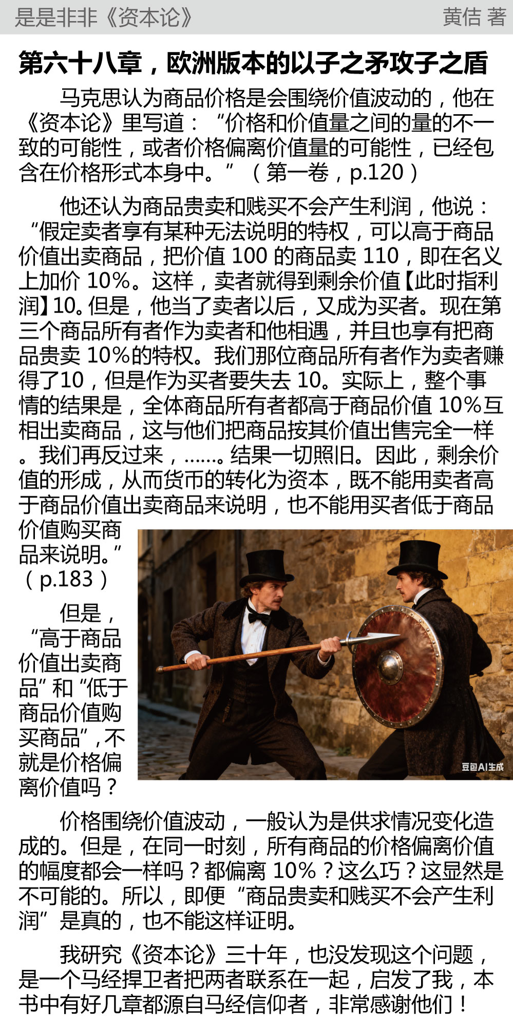 价格围绕价值波动,一般认为是供求情况变化造成的。但是,在同一时刻,所有商品的价格偏离价值的幅度都会一样吗?都偏离 10%?这么巧?这显然是不可能的。所以,即便“商品贵卖和贱买不会产生利润”是真的,也不能这样证明。
