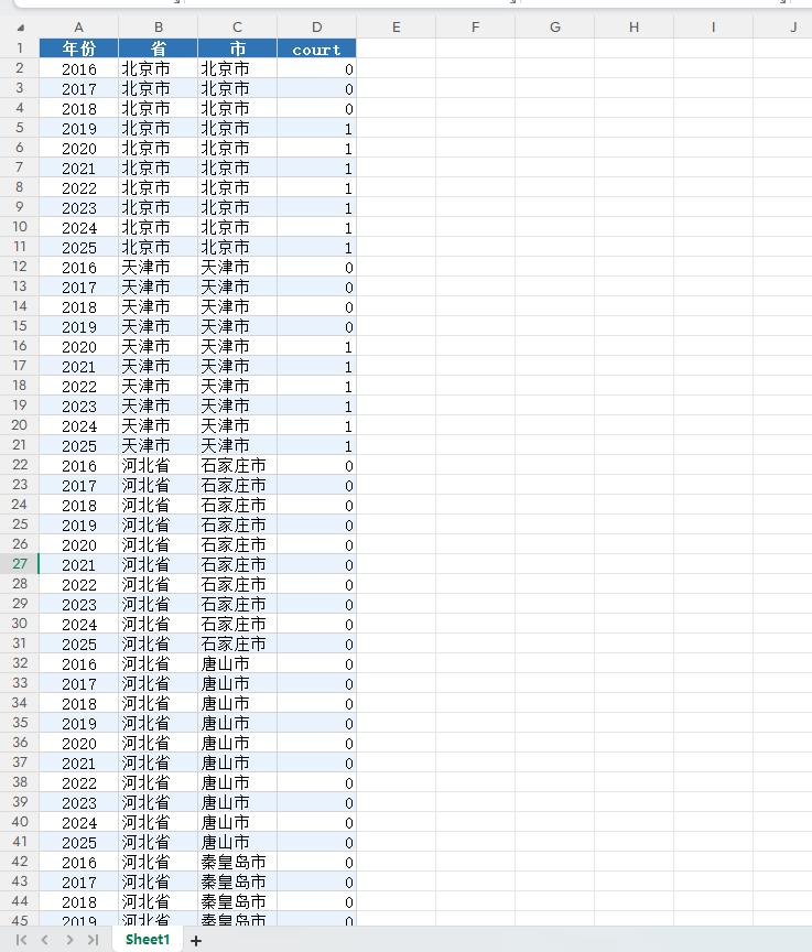 本数据构建过程中,主要参考了胡诗阳、尹亮、祝继高在《经济研究》发表的《破产法庭设立、债权人保护与地方性商业银行风险》一文。借鉴该文献中关于破产法庭政策效应的量化研究思路与方法,确保数据在实证分析中的科学性、合理性与适用性。数据以2016-2025年全国各城市为样本范围,核心构建虚拟变量“COURT”以标识破产法庭设立情况。具体规则如下:若地方性商业银行所在城市于当年1-11月设立破产法庭,该商业银行当年度及以后年度“COURT”取值为1;若当年12月设立,则下一年度及以后年度取值为1;若所在城市未设立破产法庭,或设立时间未覆盖2016-2025年样本期,则对应年度取值为0。数据涵盖年份、省份、地级市、政策状态(1=已设立,0=未设立)等核心指标,为相关实证研究提供标准化、可操作的量化依据。