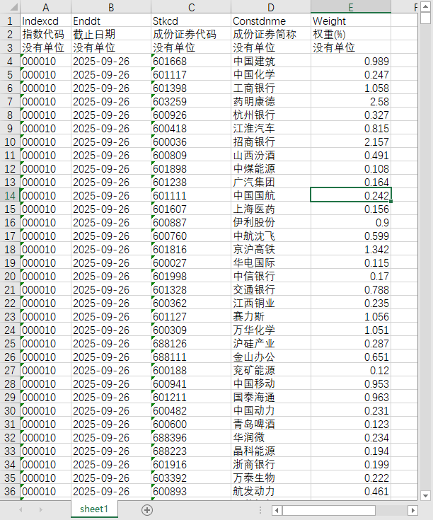 指数代码 截止日期 成份证券代码 成份证券简称 权重(%)