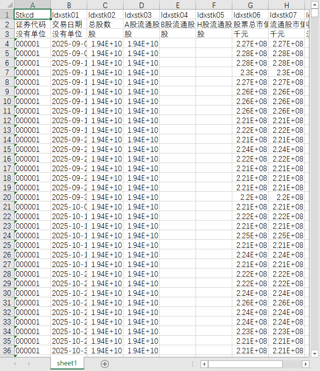 证券代码 交易日期 总股数 A股流通股数 B股流通股数 H股流通股数 股票总市值 流通股市值 收盘价 成交量