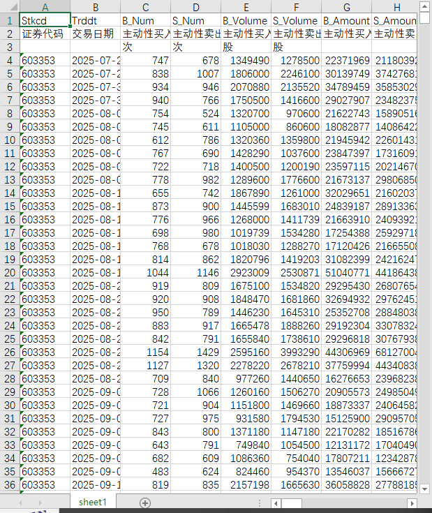 上市公司个股买卖不平衡指标表(日)20041101-20251231主动性买入成交量卖出次数特大单等