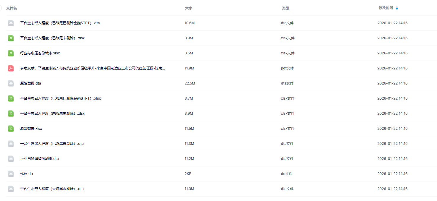 数据简介:上市公司年报中抓取与“平台生态嵌入”相关的词频数据,以此衡量企业平台生态嵌入程度,这一方法兼具可行性与科学性。为使实证分析更紧密地契合理论部分的推导逻辑,本研究将从战略嵌入、平台嵌入、生态嵌入这三个维度入手,分别爬取年报中对应维度的相关词频,进而全面刻画传统企业的平台生态嵌入程度,为优化数据分布、便于后续分析,将对每个企业的相关词频总数进行对数化处理。
