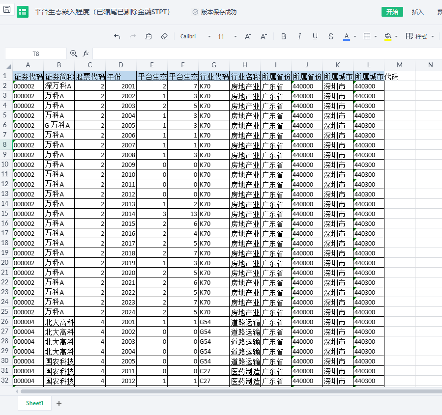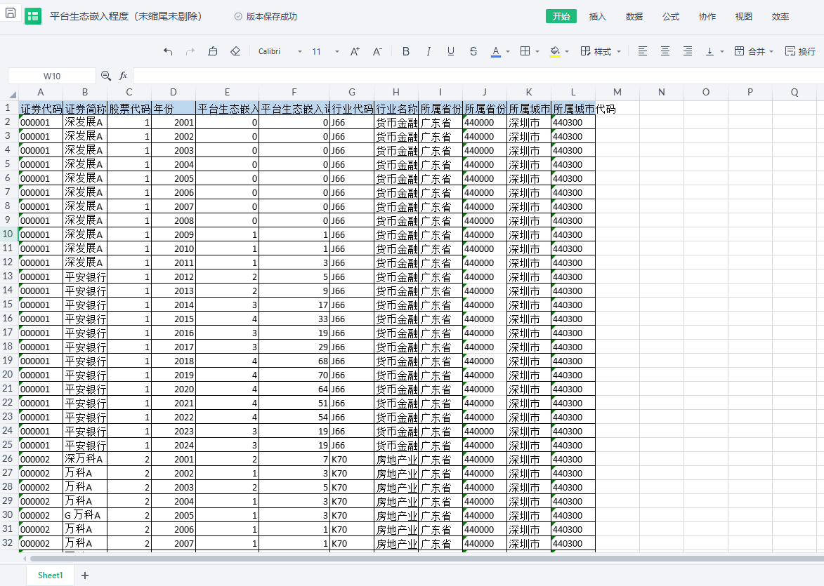 包含指标:证券代码 证券简称 股票代码 年份 平台生态嵌入程度 平台生态嵌入词频 行业代码 行业名称 所属省份 所属省份代码 所属城市 所属城市代码