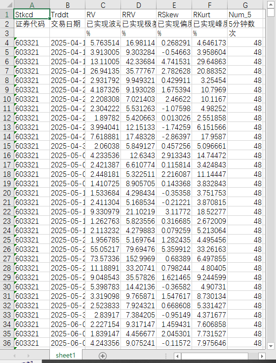 证券代码 交易日期 已实现波动率 已实现极差波动率 已实现偏度 已实现峰度 5分钟数