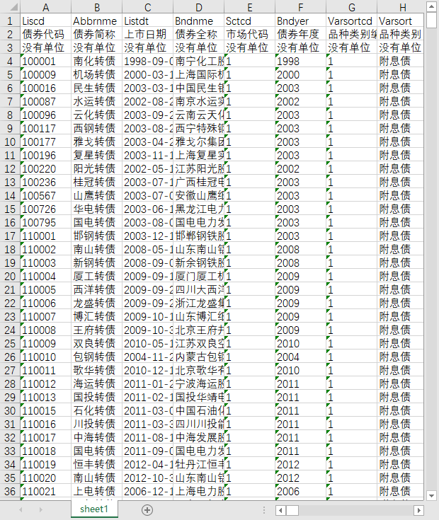 债券代码 债券简称 市场代码 上市日期 证券ID 债券全称 目前状态 债券年度 债券类型 债券期次 品种类别编码 品种类别 发行机构编码 发行机构全称 发行人股票代码 发行人股票简称 发行人上市日期 发行人退市日期 发行人上市场所 币种 实际发行量 发行价格 发行方式 期限 发行起始日期 到期日期 计息日期 止息日期 摘牌日期 付息方式编码 付息方式 计息方式编码 计息方式 年付息次数 票面利率 基准利率 基本利差 面值 信用等级 募集资金用途 可赎回性 赎回条款 赎回日期 赎回价格 可回售性 回售条款 回售日期 回售价格 可调换性(目前国债没有该数据) 提前偿还条款 是否跨市场 跨市场说明 是否可分离 计息基础 第一次付息日 行权类型 看涨看跌 票面利率选择权开始周期 票面利率选择权浮动上限(%) 票面利率选择权浮动下限(%) 承销方式 发行对象 网上发行数量 网上发行认购数量限制说明 网上发行起始日期 网上发行截止日期 发行截止日期