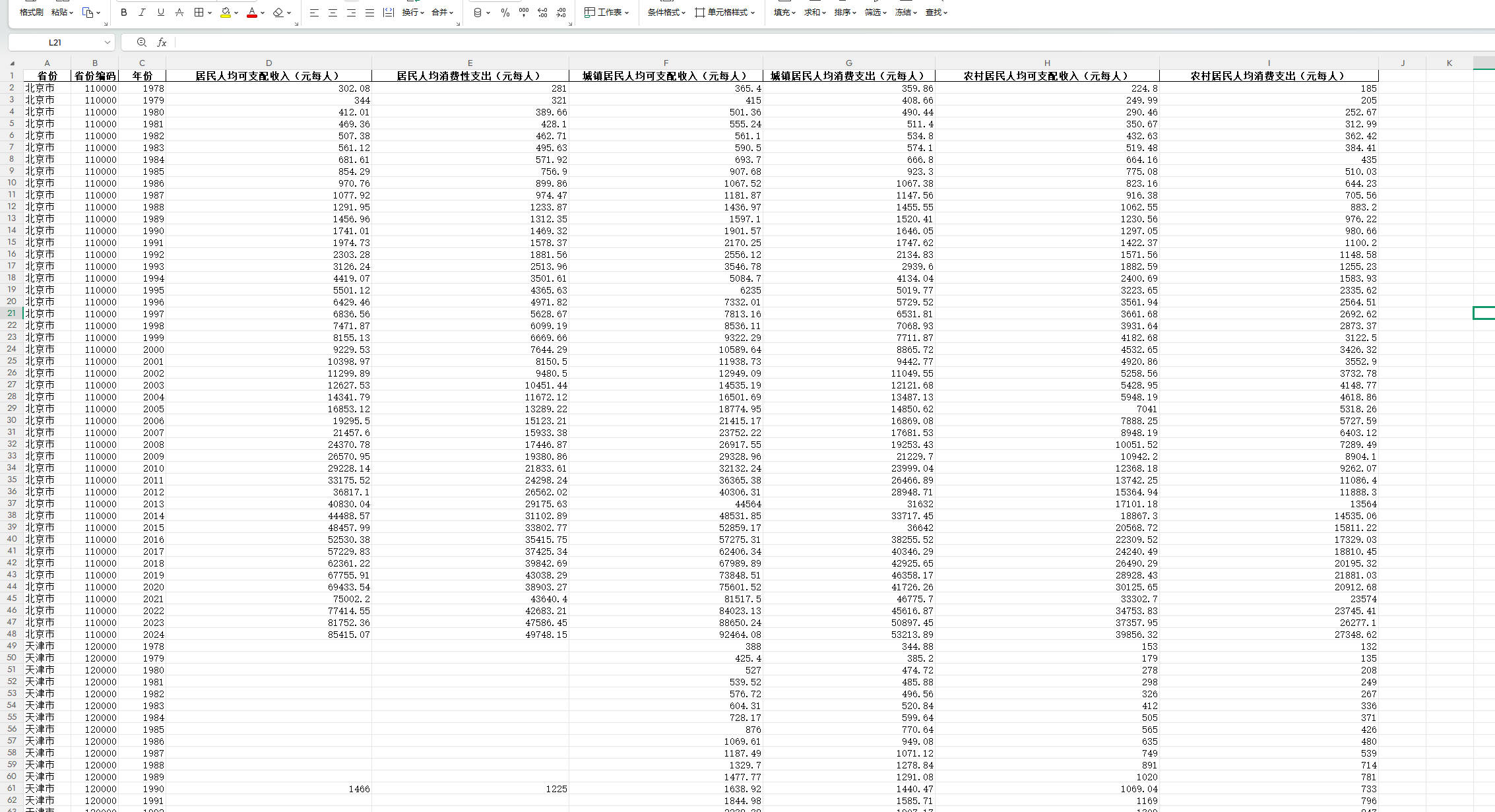本数据集汇集了中国31个省级行政区(不含港澳台)1978-2024年的居民人均