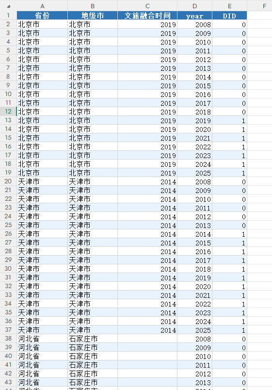 本数据以周春波等(2025)《文旅融合政策与旅游业发展:效应评估与机制检验》的研究框架为参考,构建文旅融合政策DID虚拟变量。文旅融合并非文化与旅游的简单叠加,而是指文化要素与旅游活动在产业、空间、功能、管理及服务等多维度实现深度渗透、交叉重组与协同创新的动态过程。其核心在于以文化丰富旅游的内涵与品质,以旅游拓宽文化的传播与消费渠道,最终实现文化价值与旅游价值的共生增值。