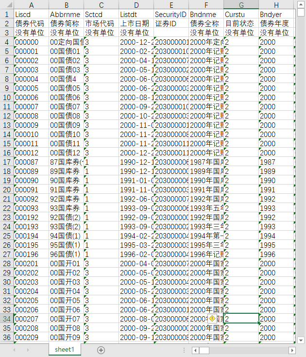 债券代码 债券简称 市场代码 上市日期 证券ID 债券全称 目前状态 债券年度 债券类型 债券期次 品种类别编码 品种类别 发行机构编码 发行机构全称 发行人股票代码 发行人股票简称 发行人上市日期 发行人退市日期 发行人上市场所 币种 实际发行量 发行价格 发行方式 期限 发行起始日期 到期日期 计息日期 止息日期 摘牌日期 付息方式编码 付息方式 计息方式编码 计息方式 年付息次数 票面利率 基准利率 基本利差 面值 信用等级 募集资金用途 可赎回性 赎回条款 赎回日期 赎回价格 可回售性 回售条款 回售日期 回售价格 可调换性(目前国债没有该数据) 提前偿还条款 是否跨市场 跨市场说明 是否可分离 计息基础 第一次付息日 行权类型 看涨看跌 票面利率选择权开始周期 票面利率选择权浮动上限(%) 票面利率选择权浮动下限(%) 承销方式 发行对象 网上发行数量 网上发行认购数量限制说明 网上发行起始日期 网上发行截止日期 发行截止日期