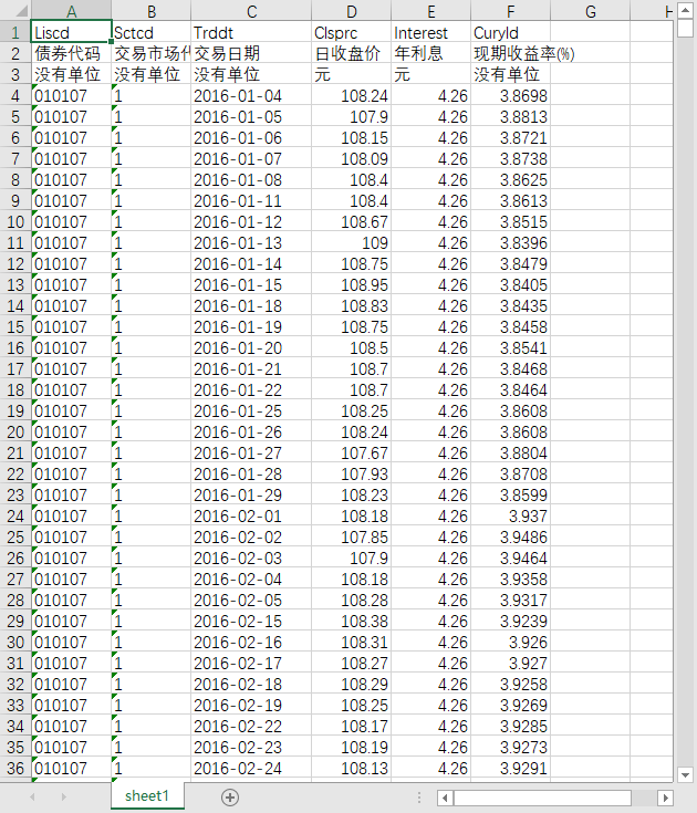 债券代码 交易市场代码 交易日期 日收盘价 年利息 现期收益率(%)