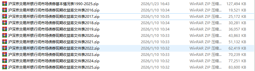 沪深京交易所银行间市场债券现期收益率文件表2016-2025日收盘价年利息现期收益率