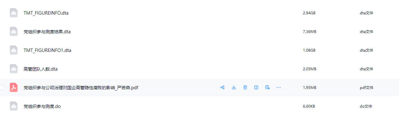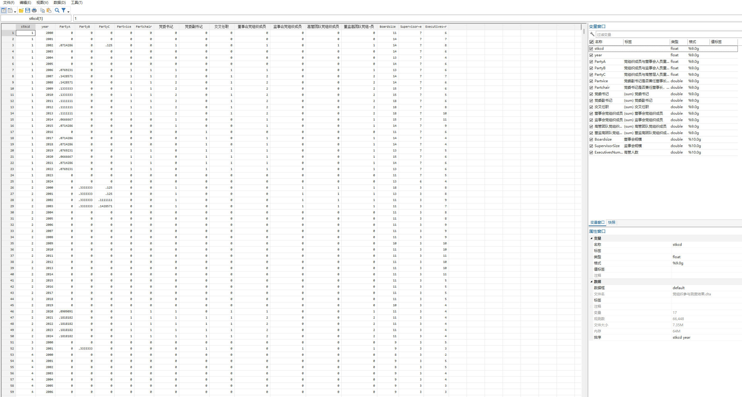 与此同时附带配套原始数据,具体指标为: stkcd year PartyA PartyB PartyC Partvice Partchair 党委书记 党委副书记 交叉任职 董事会党组织成员 监事会党组织成员 高管团队党组织成员 董监高团队党组织成员
