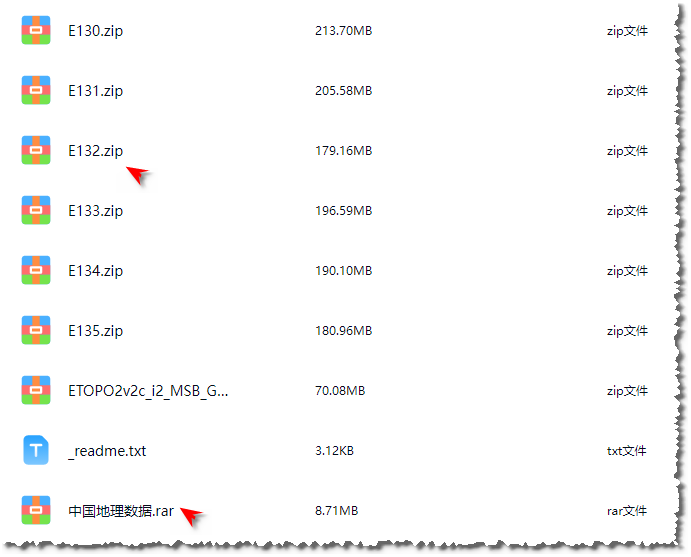 选择上面2个压缩包(Ε132 、中国地理数据)展开为例, 展示说明压缩包中的内容是什么??