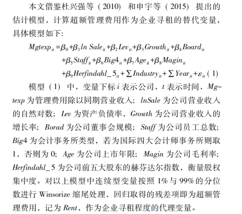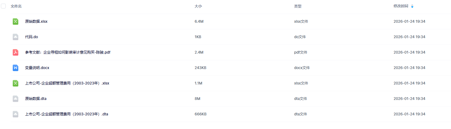 数据简介:在企业管理与财务研究领域,企业超额管理费用作为反映企业运营效率与潜在治理问题的重要指标。陈骏教授在《会计研究》2021年第7期发表的《企业寻租如何影响审计意见购买?》一文中,创新性地将超额管理费用作为企业寻租行为的代理变量,通过严谨的计量模型构建与实证分析,为该领域研究提供了兼具理论深度与实践价值的研究范式。