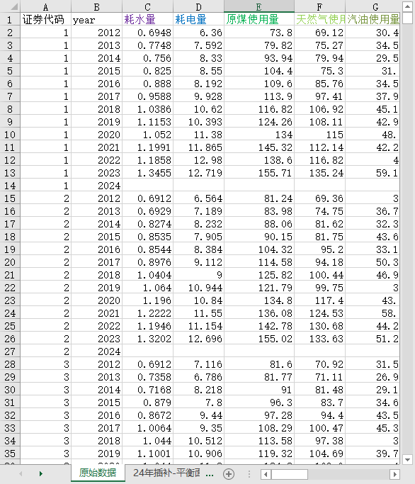 上市公司能源消耗数据2012-2024耗水量耗电量原煤天然气汽油柴油使用量集中供热