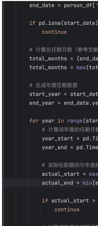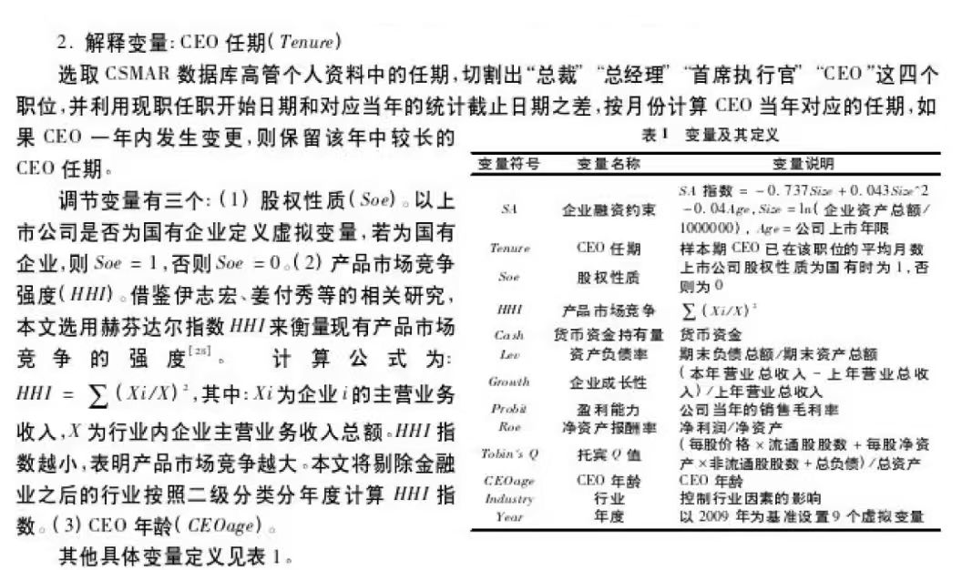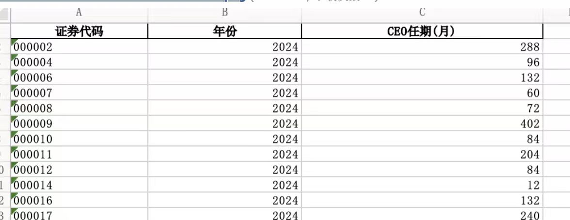 2.测算方式参考C刊《南京审计大学学报》程安林(2021)老师的研究,具体为选取CSMAR 数据库高管个人资料中的任期,切割出总经理、首席执行官、执行总经理、总经理(代理)、CEO、总裁等职位,并利用现职任职开始日期和对应当年的统计截止日期之差,按月份计算高管当年对应的任期,如果高管 一年内发生变更,则保留该年中较长的 表I 变量及其定义高管任期,最终结果为月度任期数据,ceo已在该职位的平均月数。具体可以看一下参考文献及下方图片!