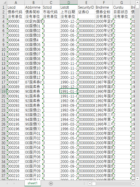 债券代码 债券简称 市场代码 上市日期 证券ID 债券全称 目前状态 债券年度 债券类型 债券期次 品种类别编码 品种类别 发行机构编码 发行机构全称 发行人股票代码 发行人股票简称 发行人上市日期 发行人退市日期 发行人上市场所 币种 实际发行量 发行价格 发行方式 期限 发行起始日期 到期日期 计息日期 止息日期 摘牌日期 付息方式编码 付息方式 计息方式编码 计息方式 年付息次数 票面利率 基准利率 基本利差 面值 信用等级 募集资金用途 可赎回性 赎回条款 赎回日期 赎回价格 可回售性 回售条款 回售日期 回售价格 可调换性(目前国债没有该数据) 提前偿还条款 是否跨市场 跨市场说明 是否可分离 计息基础 第一次付息日 行权类型 看涨看跌 票面利率选择权开始周期 票面利率选择权浮动上限(%) 票面利率选择权浮动下限(%) 承销方式 发行对象 网上发行数量 网上发行认购数量限制说明 网上发行起始日期 网上发行截止日期 发行截止日期