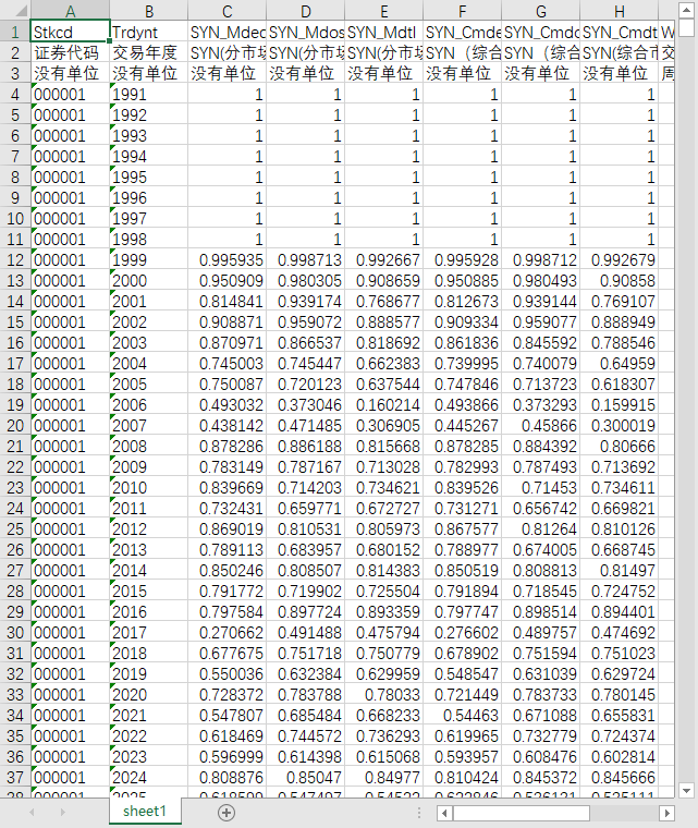 证券代码 交易年度 SYN(分市场等权平均法) SYN(分市场流通市值平均法) SYN(分市场总市值平均法) SYN(综合市场等权平均法) SYN(综合市场流通市值平均法) SYN(综合市场总市值平均法) 交易周数 市场类型 行业代码 交易状态
