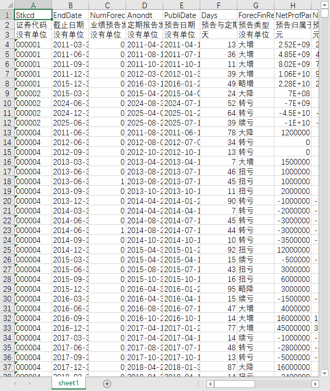 ForecFinReportType [预告类型] - 转亏、续亏、扭亏、续盈、大增、大降、略增、略降、不确定。