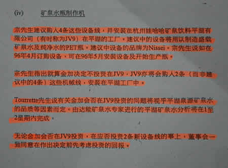 在1996年3月董事会宗庆后建议购买4条矿泉水瓶制作机,外方不同意