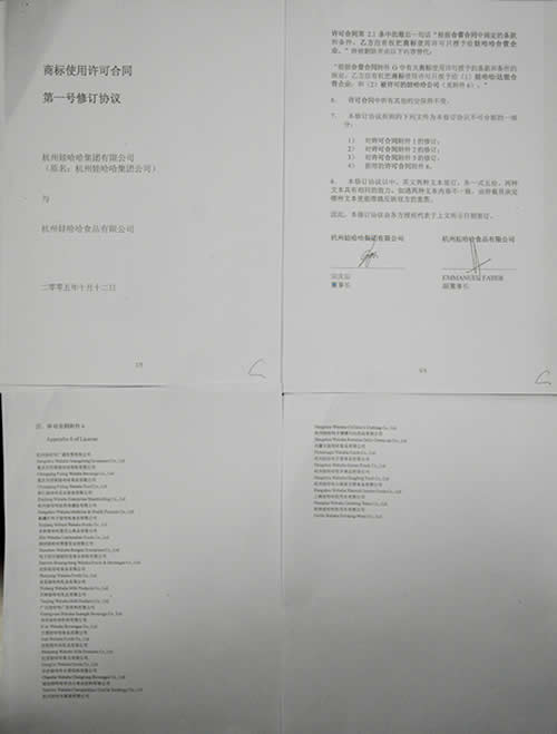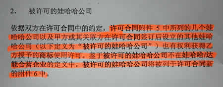 由于《商标使用许可合同》最初许可的是娃哈哈与金加合资公司,而十年来,我司与达能成立的三十九家合资企业中,除了原来的达能金加公司外,还有其他三家达能投资公司,已远远超出了原来娃哈哈金加合资公司的范围,故双方在2005年10月又签署了该合同的《第一号修订协议》,扩大原合同的许可与再被许可的产品范围,并将原娃哈哈金加合资公司变更为娃哈哈达能合资公司,但并没有增加许可费用。