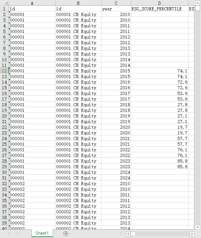 id id year ESG_SCORE_PERCENTILE ESG_DISCLOSURE_SCORE SOCIAL_DISCLOSURE_SCORE SOCIAL_PILLAR_PERCENTILE GOVNCE_DISCLOSURE_SCORE GOVERNANCE_PILLAR_PERCENTILE ENVIRONMENTAL_PILLAR_PERCENTILE ENVIRON_DISCLOSURE_SCORE BS_GOODWILL UN_GLOBAL_COMPACT_SIGNATORY EMPLOYEE_TURNOVER_PCT
