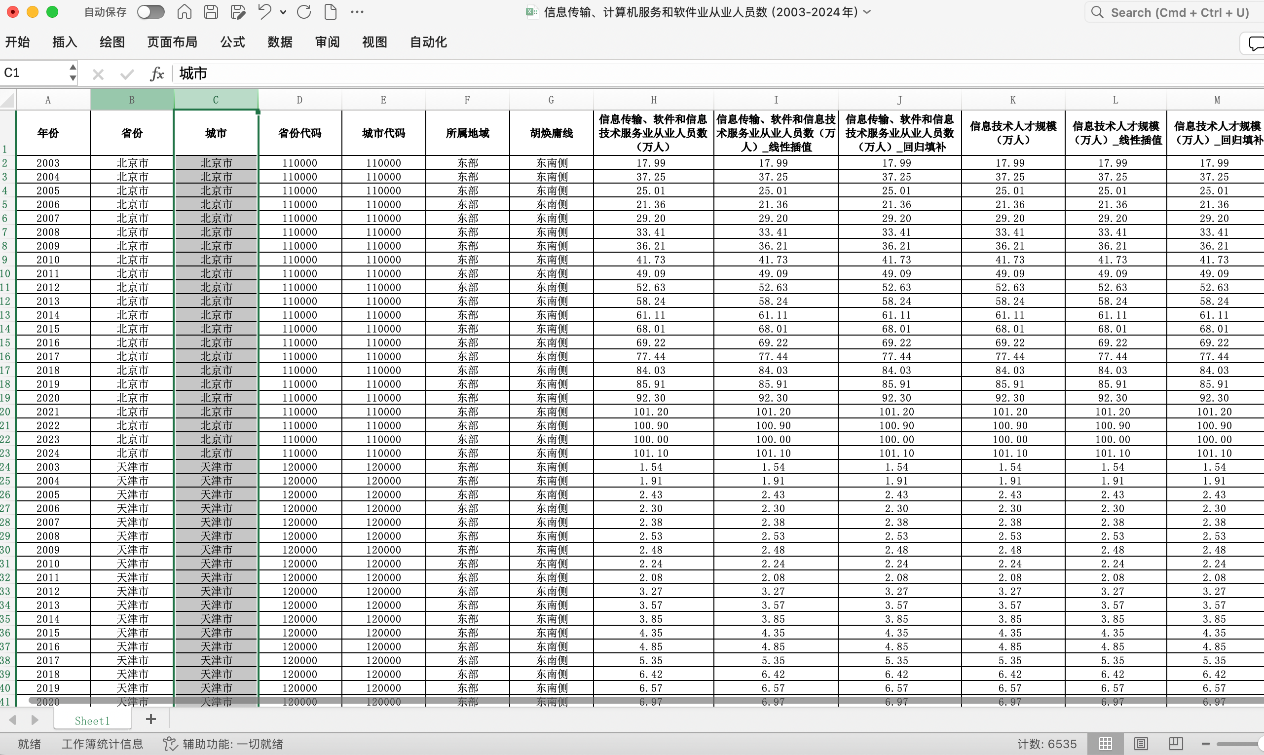 全国地级市信息传输、计算机服务和软件业从业人员数数字人才与信息技术人才规模数据(从业人员存量测度方法,2003–2024年,覆盖全国地级市)