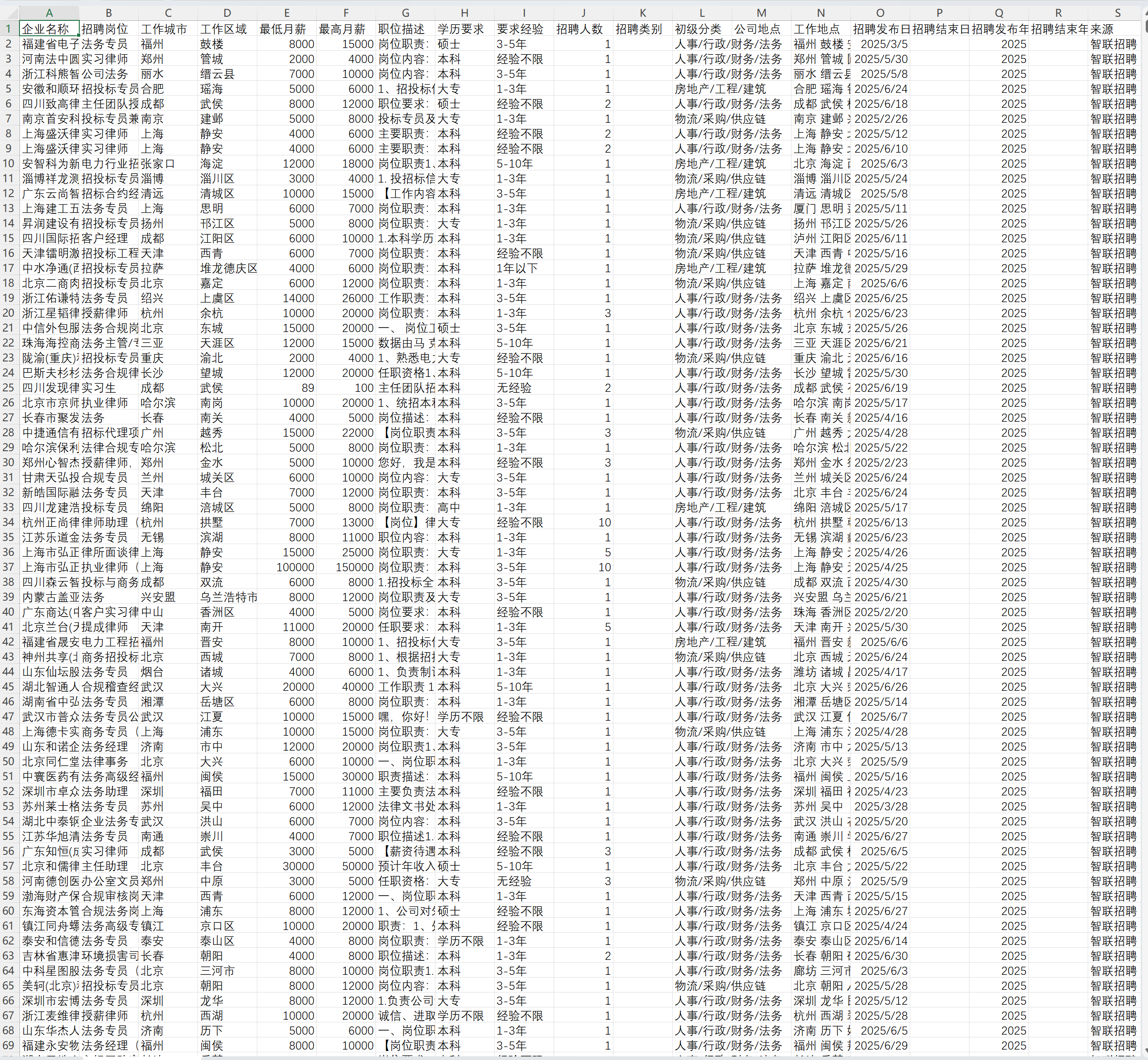 团队参考《中国工业经济》等顶刊的做法,通过大数据爬取技术,采集了智联招聘平台历年发布的招聘岗位信息,时间范围为2016-2025.7,样本量达1300万余条。包括招聘职位、招聘人数、学历要求、薪资待遇等