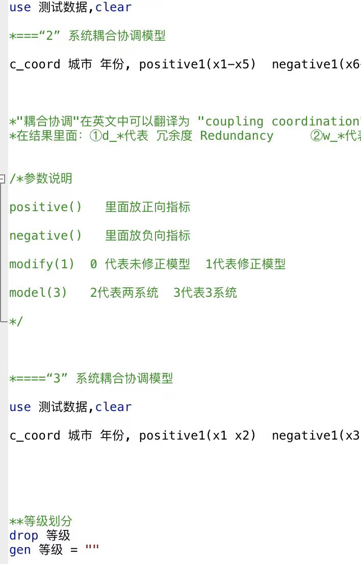 此资料包括stata耦合协调模型的代码、数据及参考文献案例,大家将自己数据带入即可,数据给大家用x1 x2做了简化,方便大家能看懂!