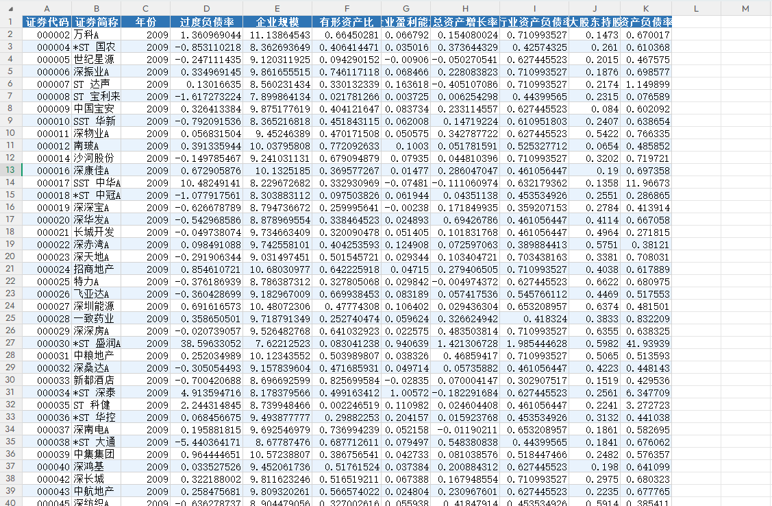 证券代码 | 证券简称 | 年份 | 过度负债率 | 企业规模 | 有形资产比 |